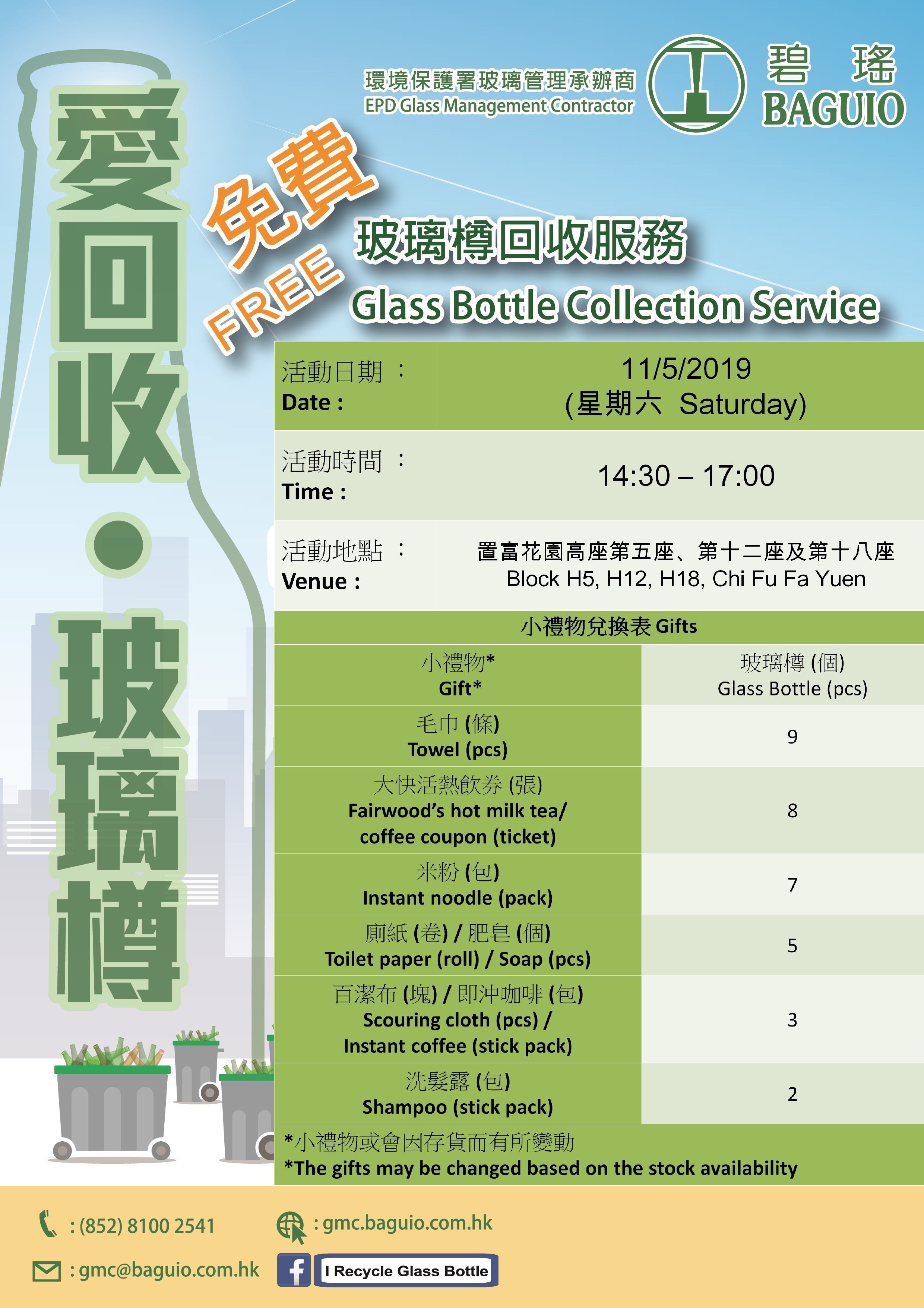 *The redemption is opened for The Chi Fu Fa Yuen’s residents only. Baguio will organize more varied glass bottle recycling activities at different locations. To know more about our coming activities, please stay tuned to our “I Recycle Glass Bottle” website and follow our Facebook page.