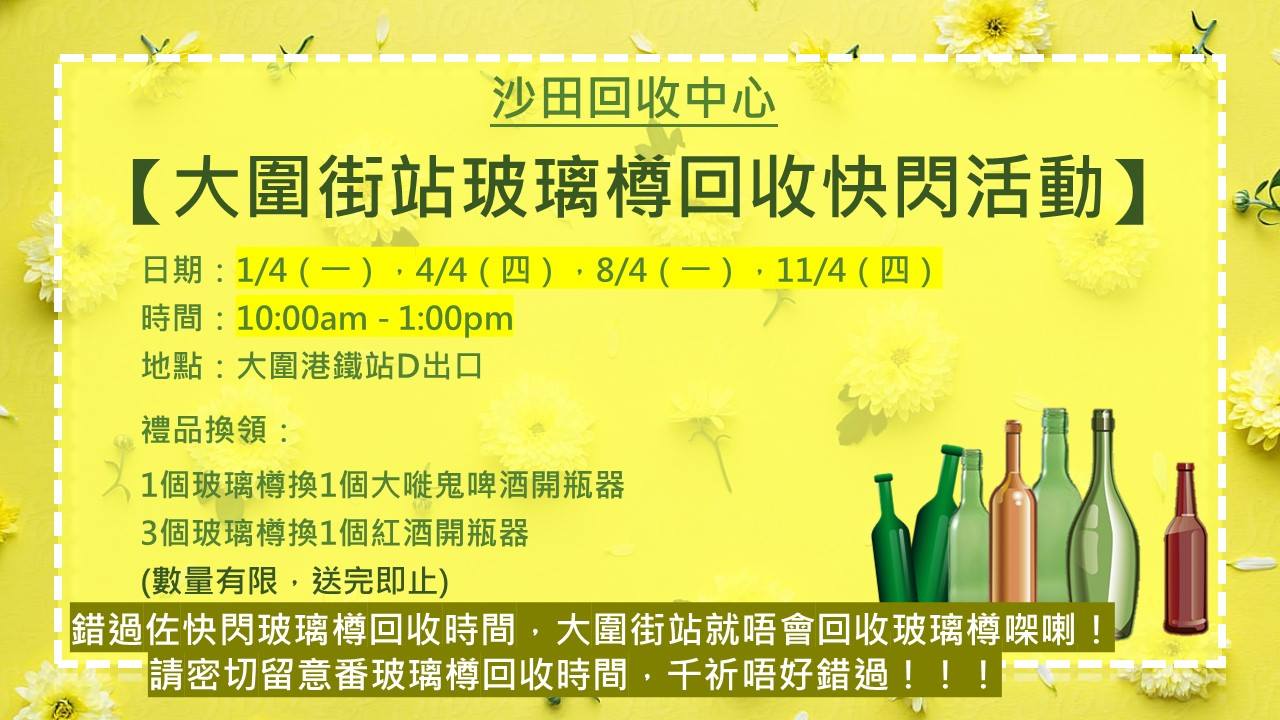 為有效提升玻璃樽回收成效及鼓勵大家積極進行玻璃樽乾淨回收,碧瑤於2019年4月與馬鞍山青年協會於大圍港鐵站D出口進行玻璃樽以物易物回收活動,市民可以指定數量的廢玻璃樽換取大嘥鬼珍藏版禮物。 如欲獲得更多關於未來玻璃樽回收活動的詳情,可以定期瀏覽「愛回收.玻璃樽」官方網站及追蹤Facebook專頁。 下載詳情
